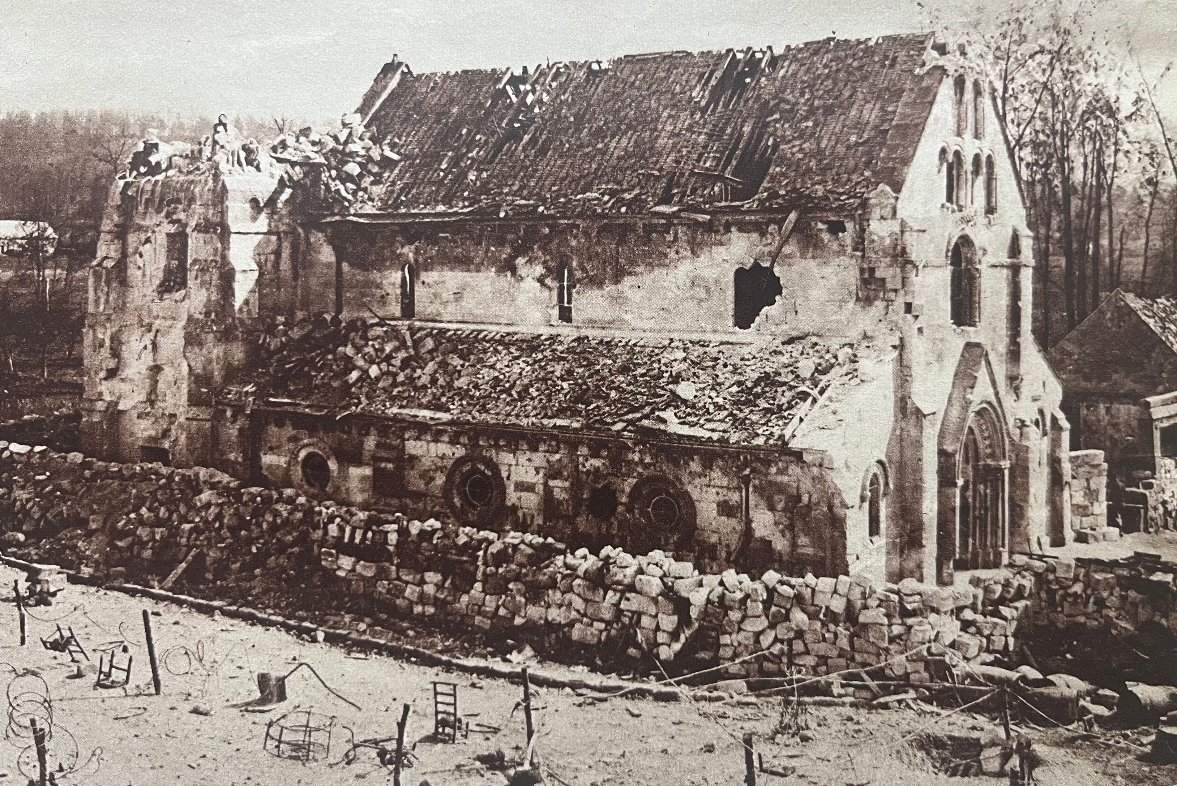 The small town of Tracy-le-Val, [about fifty miles southeast of Amiens] which had only 532 inhabitants, was one of the points along the front that suffered the harshest enemy attacks. This is evident from the state of the church, surrounded by a network of barbed wire. The worshippers' chairs were used as barricades.
